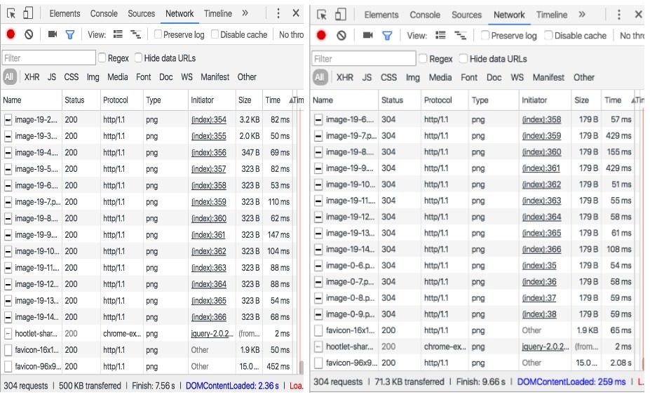 My web site was a simple HTML page that had a table of 15 columns and 20 rows of small PNG files. Each image file was a different size that varied from 1k to 8k but the total sum of all 304 requests (the images and other HTML resources) added up to about 500Kb.