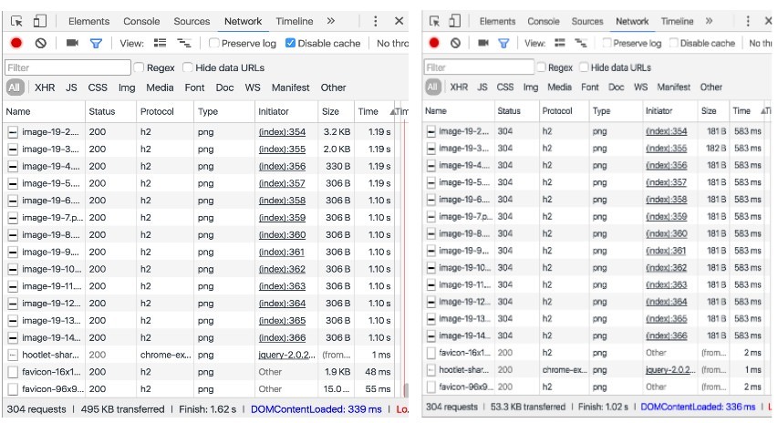 As you can see from the images above, upon the second request (on both servers) the images were already cached but the load times are much different. For H1, 71Kb was pulled down, and for H2 only about 53Kb was pulled down. This told me that the header compression for H2 was working, and saving me even more time and round trips. The speed of H1 did not really improve for the second request even though only the header information was pulled. Why? Because those 300 requests were using 6 connections and connections are the expensive part to H1. All of those trips back and forth were text-based with full headers for each one. The difference in the request time could be explained with a slight change in network conditions or server load between requests. But it makes a pretty big deal to the end user who is waiting 9 seconds to get their graphically oriented page to render. With H2, you have one, fast, binary connection. This is where H2 starts to show its value.